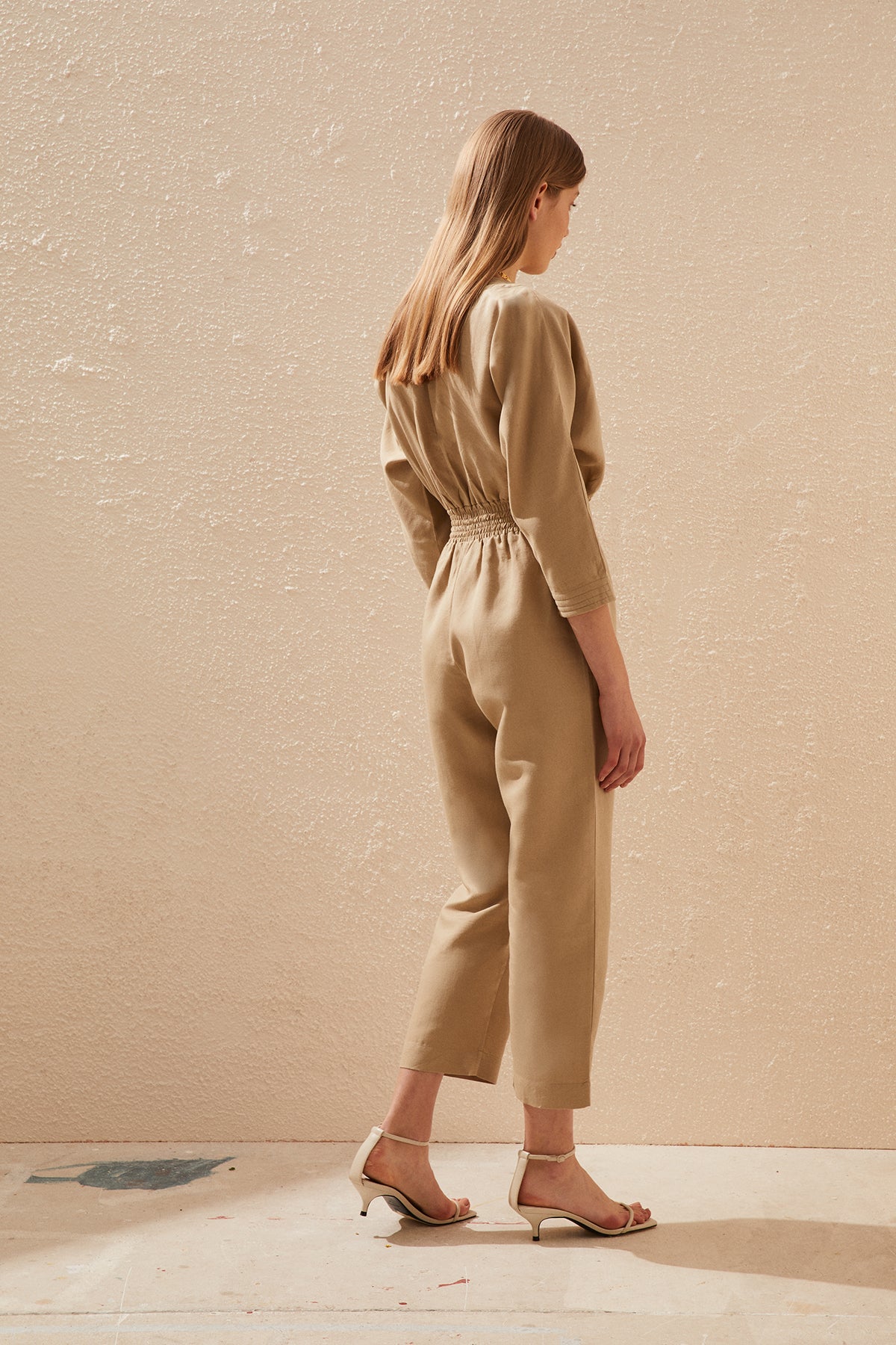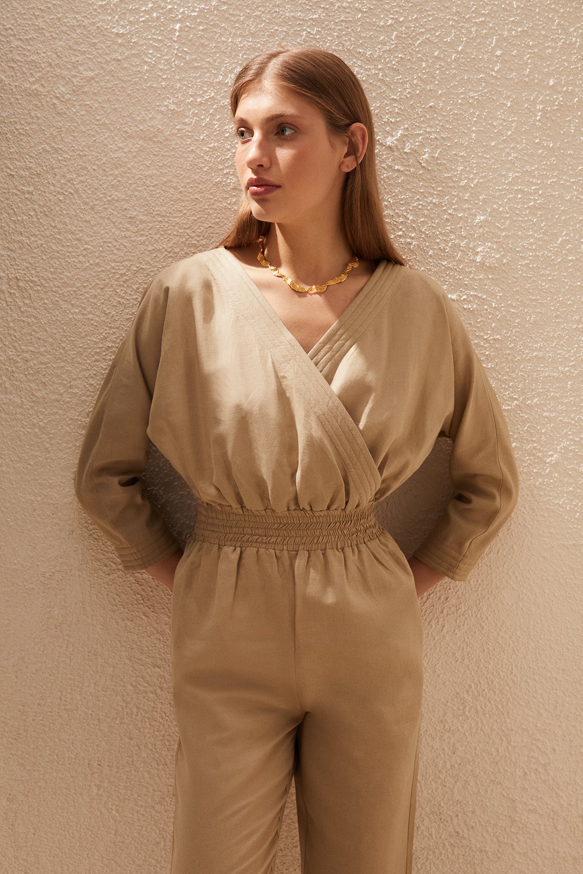 The Aura Jumpsuit, with straight legs and dolman sleeves, is made from cotton&linen blend. The elasticated waist line makes it comfortable and easy to wear for any occasion day or night, easy to style with flat sandals or heels. Nicely finished with fluting detail around the neck and sleeves.