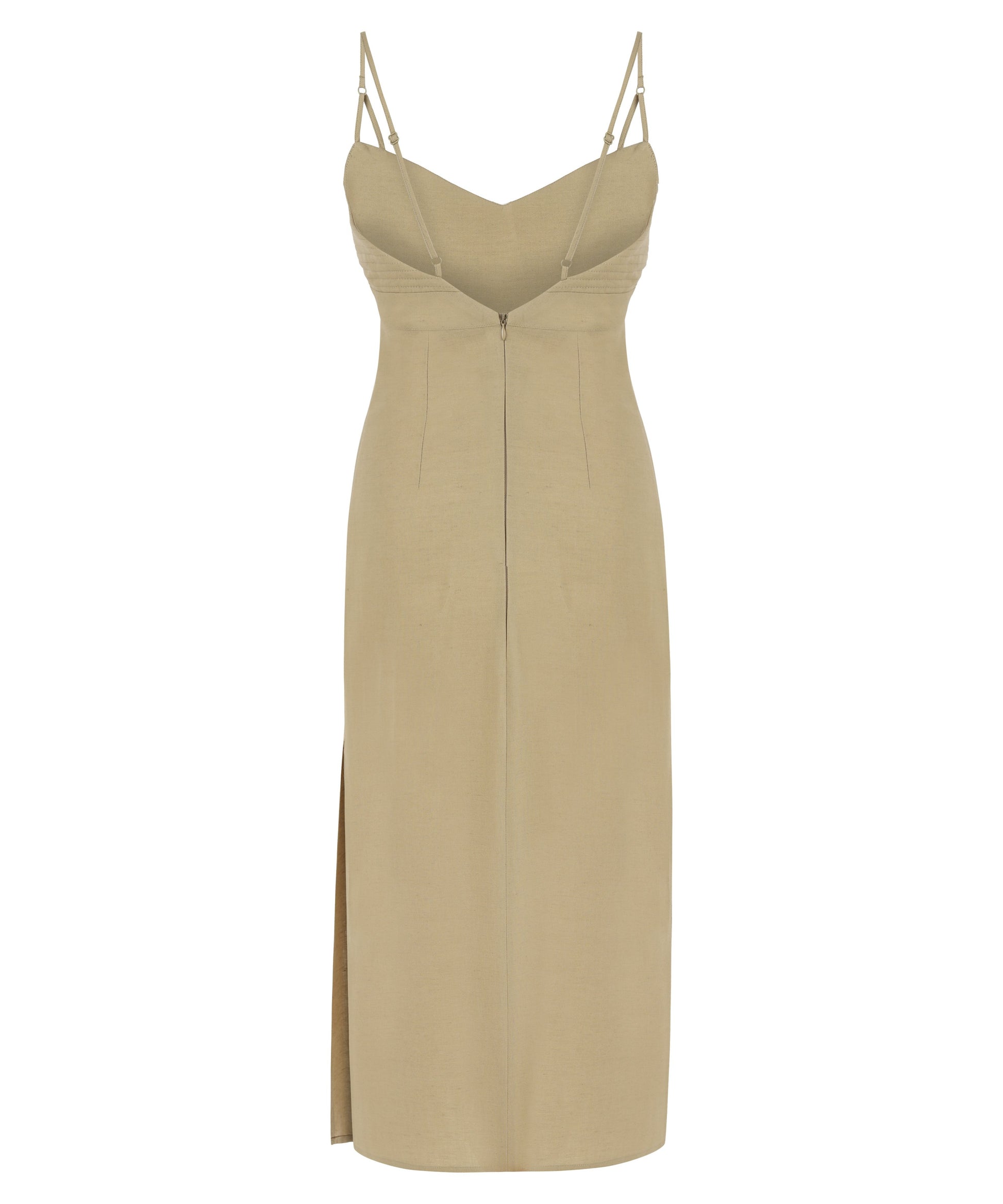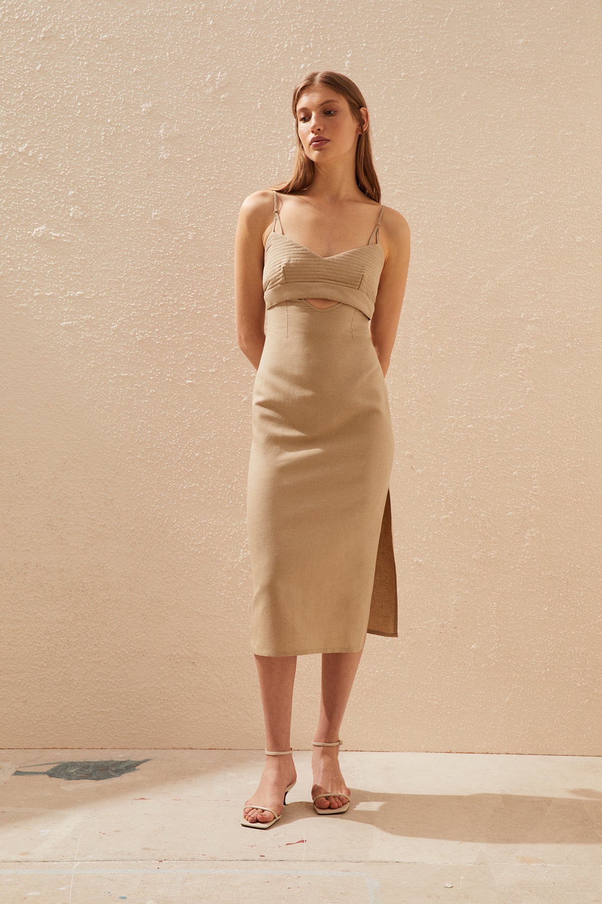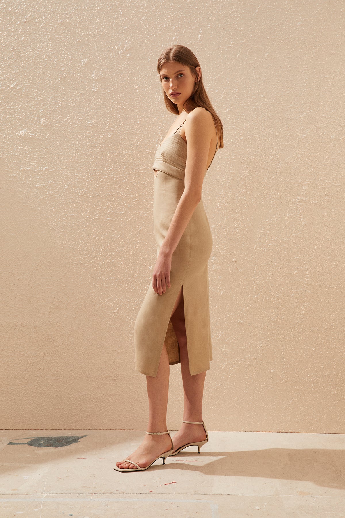 The Sonia Dress and its adjustable spagetti straps falls into the refined neckline with a fine stitching detail. The front cut-out adds a refreshment and the side slit shows some legs. With the help of front and back darts it curves nicely on the waist. Wear with flat sandals for a day in the city and high heels for a night transition.